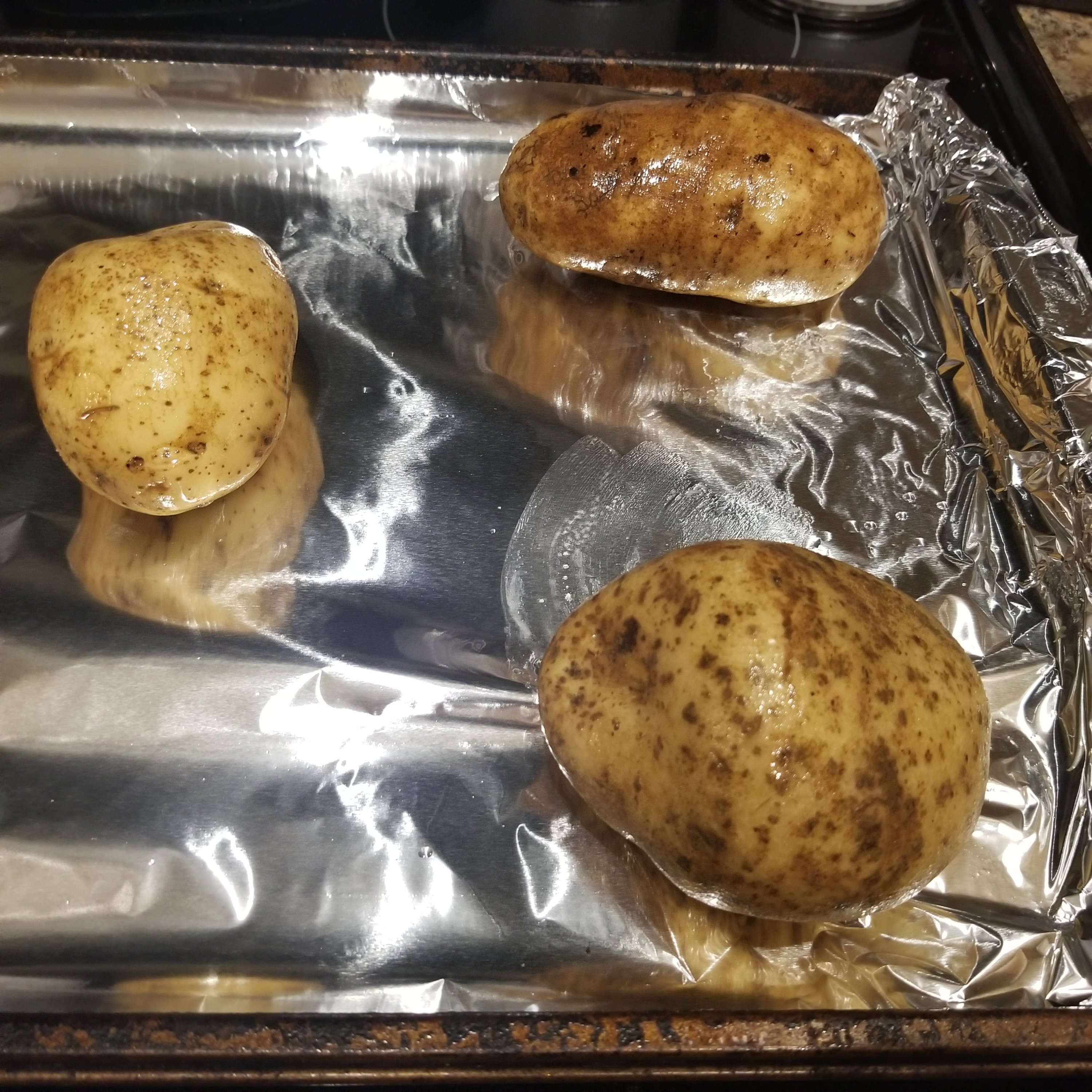 - Wash potatoes and pat dry. Pierce the potatoes with a fork 4-5 times, then drizzle a little canola over the potatoes and rub it over them before placing on a baking sheet.