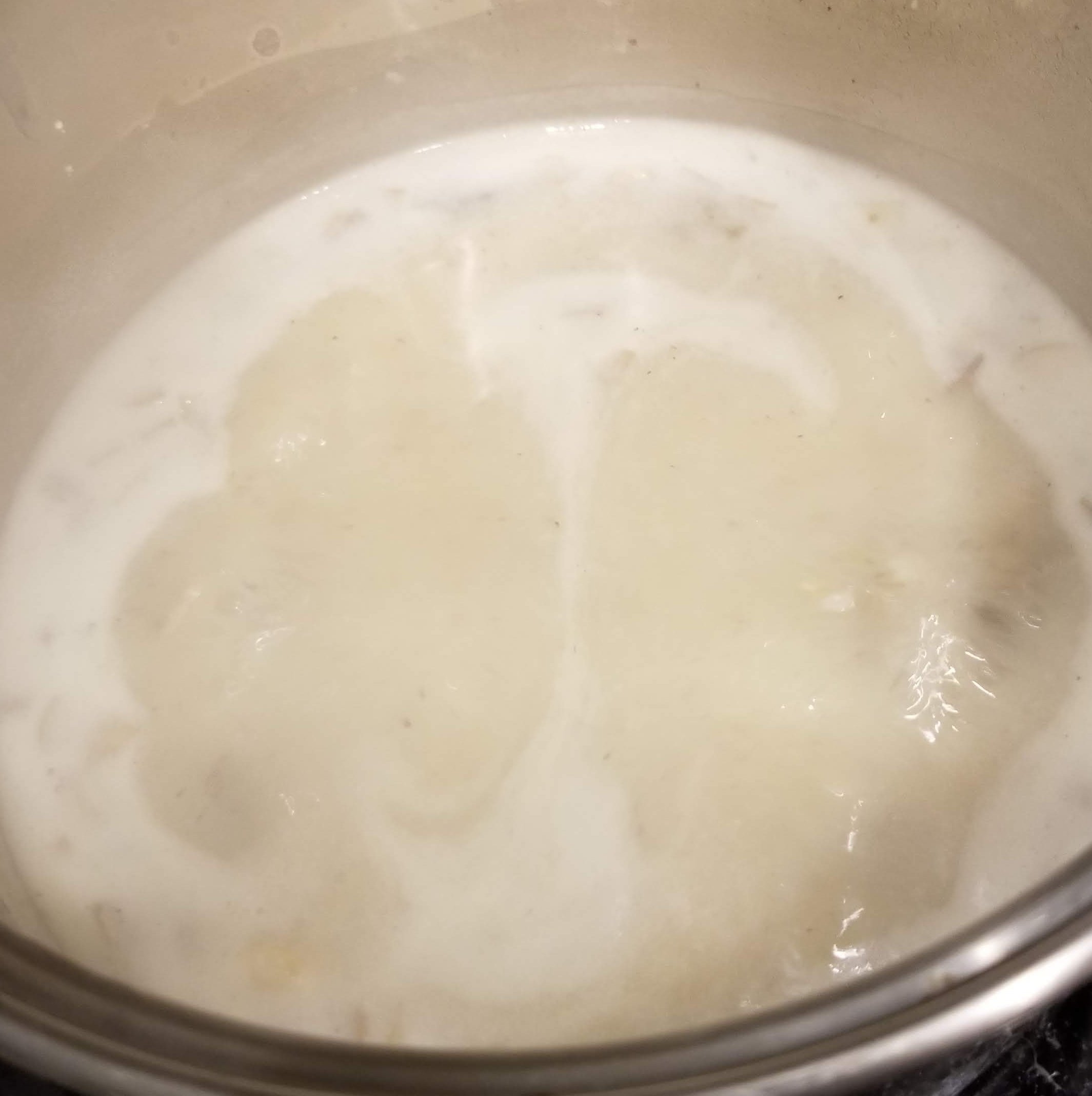- Add to the sauce pan the vegetable broth, rice milk, gf flour, salt & pepper. Bring to a slow boil.