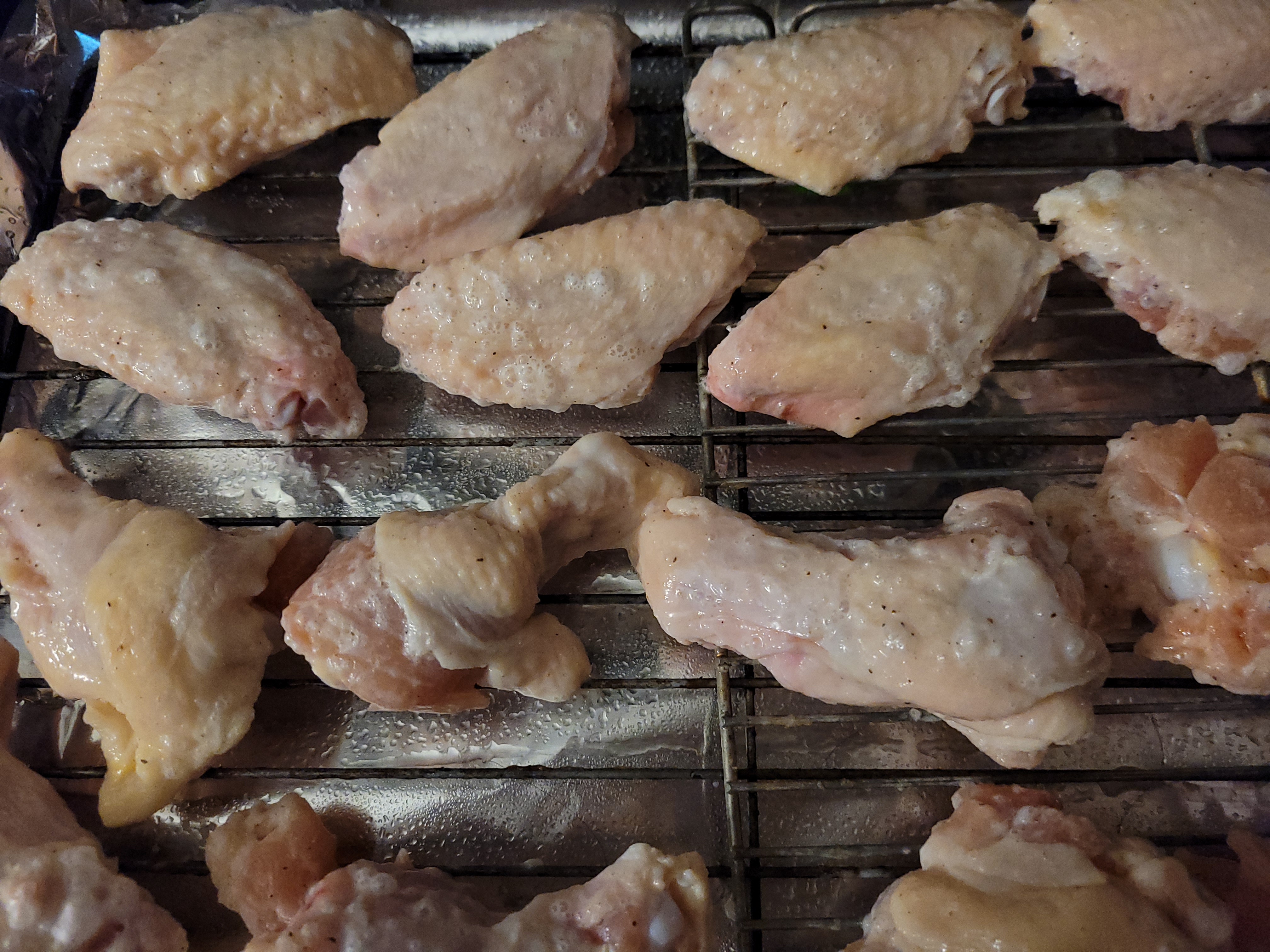 - Place the coated wing pieces on the wire rack coated with cooking spray. Repeat for the remaining wing pieces.