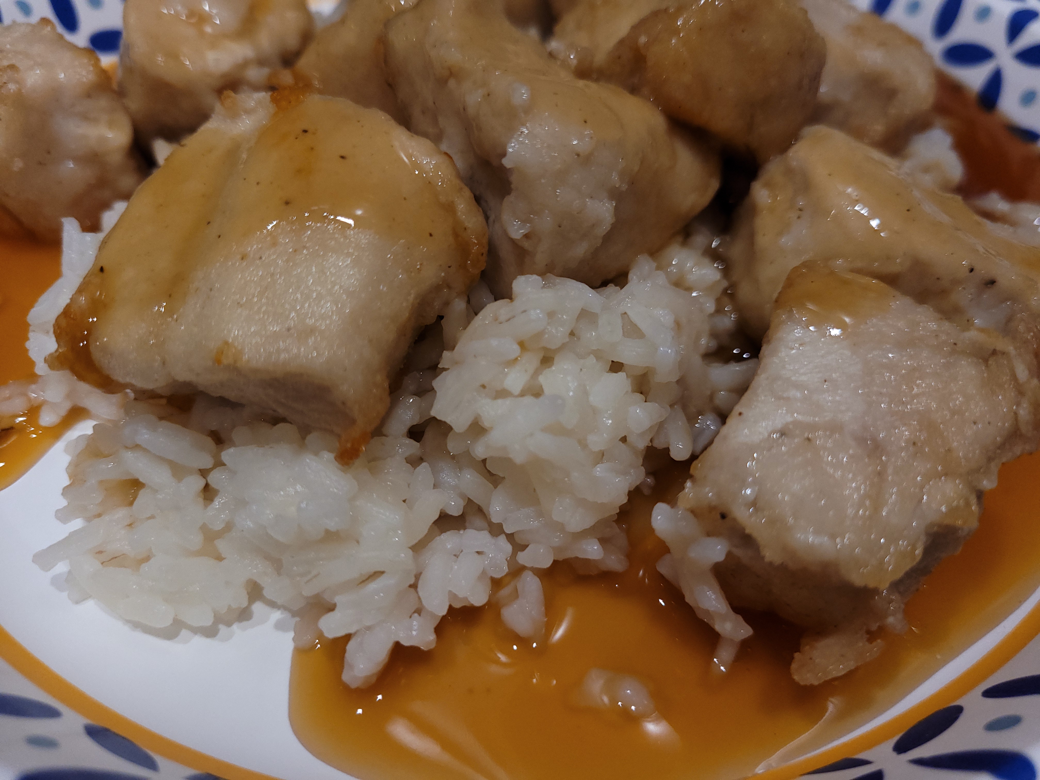 - Plate everything together by scooping some of the cooked rice into a plate then top with about 1/4 of the cooked chicken, and a ladle or two of the cashew sauce